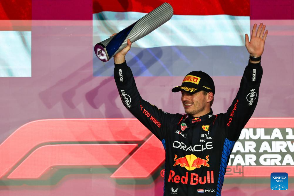 LUSAIL, 2 diciembre, 2024 (Xinhua) -- Imagen del 1 de diciembre de 2024 del piloto neerlandés de la escudería Red Bull, Max Verstappen, festejando en el podio después de la carrera del Gran Premio de Qatar de F1, en el Circuito Internacional de Lusail, en Lusail, Qatar. (Xinhua/Qian Jun)