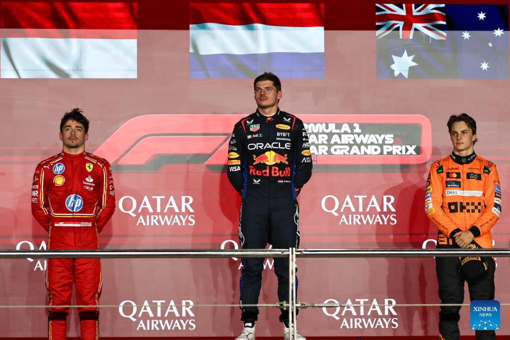 LUSAIL, 2 diciembre, 2024 (Xinhua) -- Imagen del 1 de diciembre de 2024 del ganador del primer lugar, el piloto neerlandés de la escudería Red Bull, Max Verstappen (c), el ganador del segundo lugar, el piloto monegasco de la escudería Ferrari, Charles Leclerc (i) y el ganador del tercer lugar, el piloto australiano de la escudería McLaren, Oscar Piastri (d), posando en el podio después de la carrera del Gran Premio de Qatar de F1, en el Circuito Internacional de Lusail, en Lusail, Qatar. (Xinhua/Qian Jun)