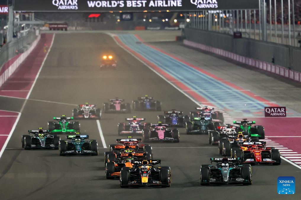LUSAIL, 2 diciembre, 2024 (Xinhua) -- Imagen del 1 de diciembre de 2024 de pilotos arrancando durante la carrera del Gran Premio de Qatar de F1, en el Circuito Internacional de Lusail, en Lusail, Qatar. (Xinhua/Qian Jun)