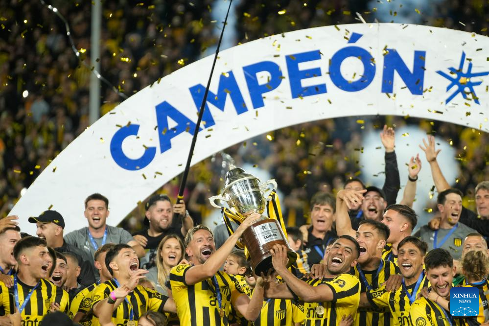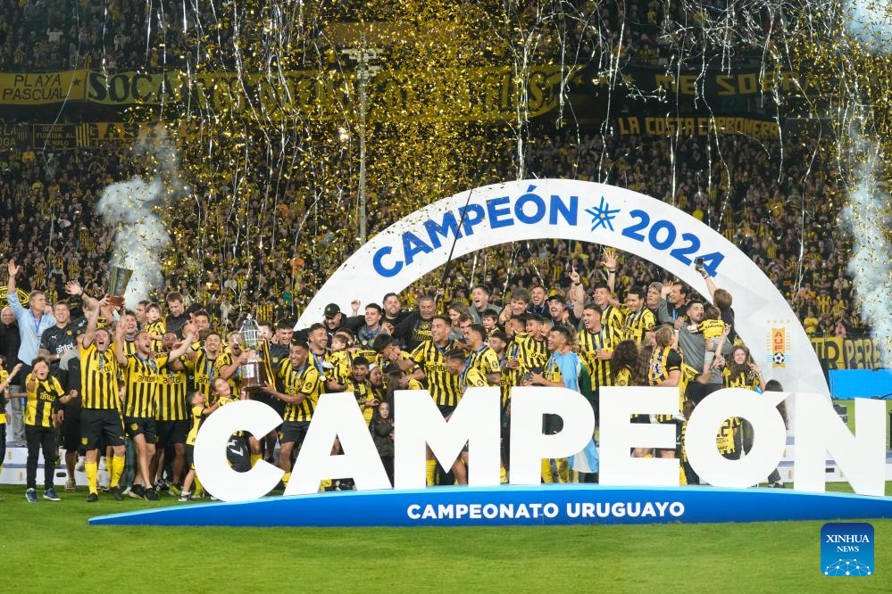 MONTEVIDEO, 2 diciembre, 2024 (Xinhua) -- Imagen del 1 de diciembre de 2024 de jugadores de Peñarol festejando la obtención del Campeonato Uruguayo de Fútbol durante la última fecha del Torneo Clausura ante Fénix, celebrado en el Estadio Centenario, en Montevideo, capital de Uruguay. (Xinhua/Nicolás Celaya)