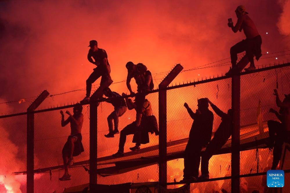 MONTEVIDEO, 2 diciembre, 2024 (Xinhua) -- Imagen del 1 de diciembre de 2024 de aficionados de Peñarol festejando la victoria y obtención del Campeonato Uruguayo de Fútbol durante la última fecha del Torneo Clausura ante Fénix, celebrado en el Estadio Centenario, en Montevideo, capital de Uruguay. (Xinhua/Nicolás Celaya)
