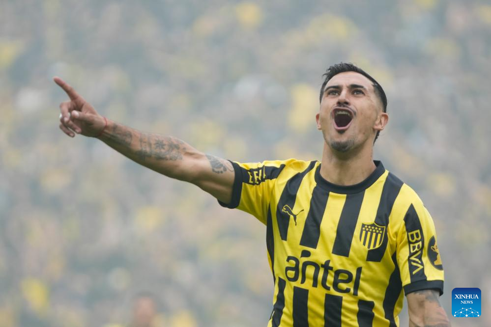 MONTEVIDEO, 2 diciembre, 2024 (Xinhua) -- Imagen del 1 de diciembre de 2024 del jugador Eduardo Darias, de Peñarol, festejando su anotación durante la última fecha del Torneo Clausura del Campeonato Uruguayo de Fútbol ante Fénix, celebrado en el Estadio Centenario, en Montevideo, capital de Uruguay. (Xinhua/Nicolás Celaya)