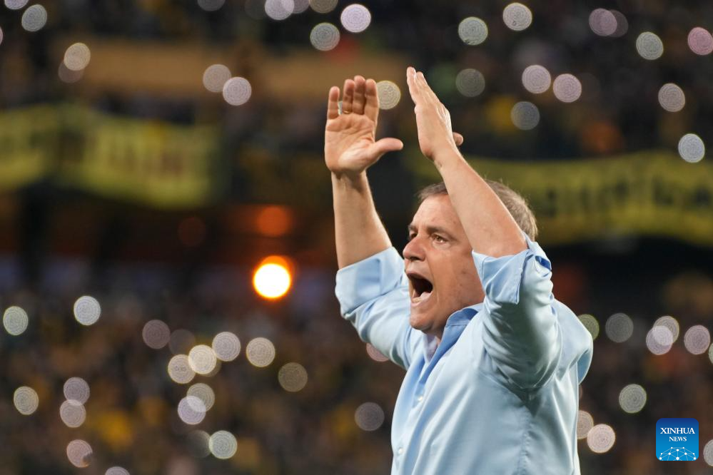 MONTEVIDEO, 2 diciembre, 2024 (Xinhua) -- Imagen del 1 de diciembre de 2024 del director técnico, Diego Aguirre, de Peñarol, festejando la victoria y obtención del Campeonato Uruguayo de Fútbol durante la última fecha del Torneo Clausura ante Fénix, celebrado en el Estadio Centenario, en Montevideo, capital de Uruguay. (Xinhua/Nicolás Celaya)
