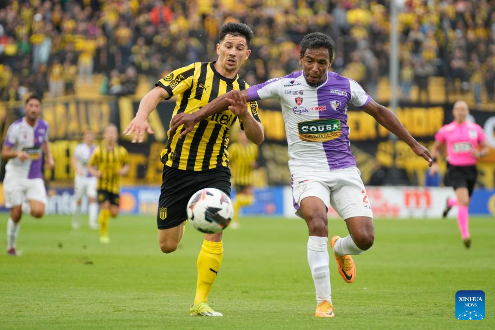 MONTEVIDEO, 2 diciembre, 2024 (Xinhua) -- Imagen del 1 de diciembre de 2024 del jugador Maximiliano Silvera (i), de Peñarol, disputando el balón con Juan Alvez (d), de Fénix, durante la última fecha del Torneo Clausura del Campeonato Uruguayo de Fútbol, celebrado en el Estadio Centenario, en Montevideo, capital de Uruguay. (Xinhua/Nicolás Celaya)