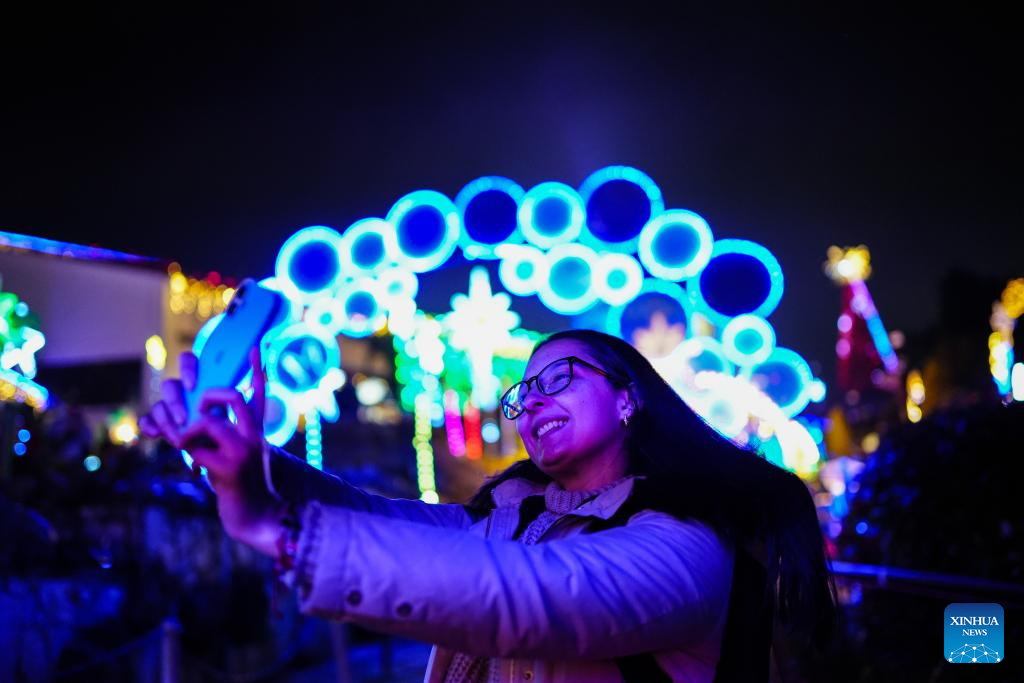 BOGOTA, 4 diciembre, 2024 (Xinhua) -- Imagen del 3 de diciembre de 2024 de una mujer tomándose una fotografía mientras visita las decoraciones de luces del alumbrado navideño del cerro de Monserrate, en Bogotá, Colombia. (Xinhua/Andrés Moreno)