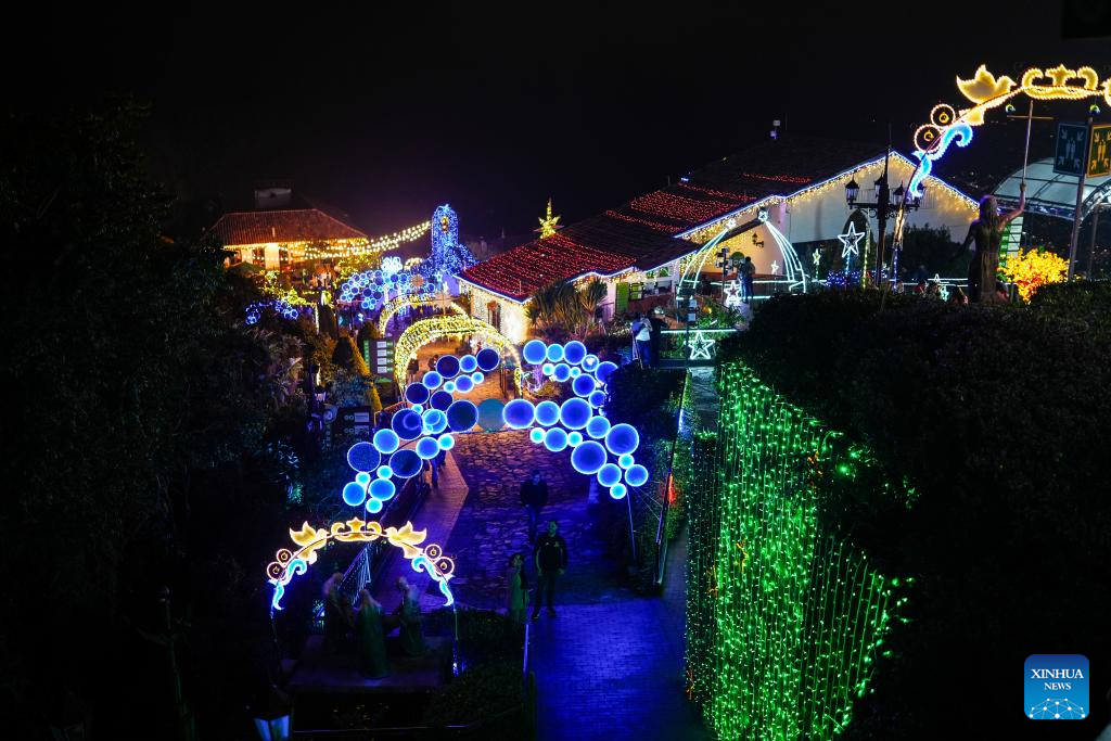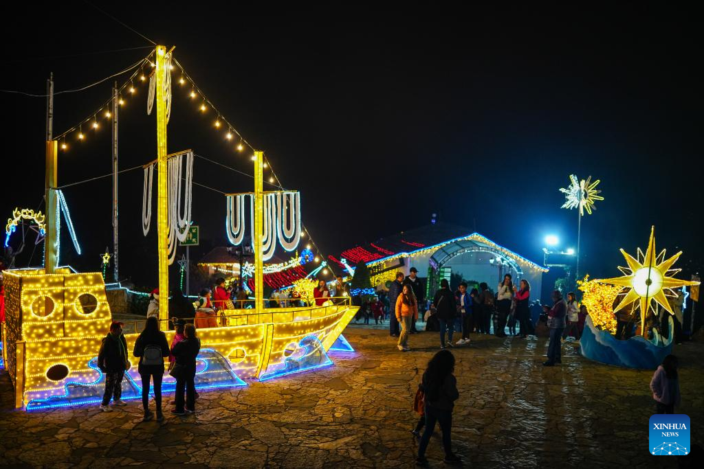 BOGOTA, 4 diciembre, 2024 (Xinhua) -- Imagen del 3 de diciembre de 2024 de personas recorriendo las decoraciones de luces del alumbrado navideño del cerro de Monserrate, en Bogotá, Colombia. (Xinhua/Andrés Moreno)