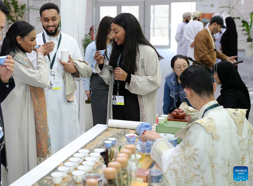 RIAD, 5 diciembre, 2024 (Xinhua) -- Imagen del 4 de diciembre de 2024 de personas degustando té chino en el Pabellón de China durante la 16ª Conferencia de las Partes (COP16) de la Convención de las Naciones Unidas de Lucha contra la Desertificación (UNCCD, por sus siglas en inglés), en Riad, Arabia Saudita. Con una superficie de más de 600 metros cuadrados, el Pabellón de China es el segundo pabellón nacional más grande del evento. Su exposición, con el tema "La Gran Muralla Verde de los Siglos, la Restauración de China en Acción", muestra la batalla de la nación contra la desertificación, en particular a través del Programa de la Franja Forestal Protectora de los Tres Nortes, una importante iniciativa nacional destinada a revertir la desertificación de la tierra. (Xinhua/Wang Dongzhen)