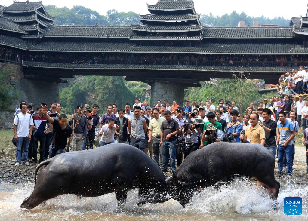 BEIJING, 5 diciembre, 2024 (Xinhua) -- Imagen del 4 de octubre de 2013 de una pelea de toros tradicional llevada a cabo junto al puente Batuan, un puente cubierto de madera del grupo étnico dong local, denominado "puente viento-lluvia", en el distrito autónomo dong de Sanjiang, en la región autónoma de la etnia zhuang de Guangxi, en el suroeste de China. La Organización de las Naciones Unidas para la Educación, la Ciencia y la Cultura (UNESCO) reconoció el jueves al diseño y las técnicas tradicionales chinas de construcción de puentes con arcadas de madera en su Lista Representativa del Patrimonio Cultural Inmaterial de la Humanidad, los cuales están desde 2009 en la lista del Patrimonio Cultural Inmaterial que requiere medidas urgentes de salvaguardia. (Xinhua/Tan Kaixing)
