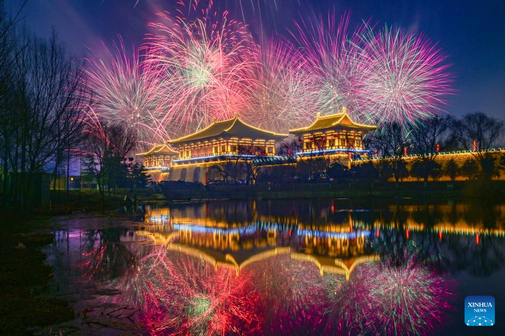 Imagen del 10 de febrero de 2024 de fuegos artificiales durante las celebraciones del Festival de Primavera, en la ciudad de Luoyang, en la provincia de Henan, en el centro de China. El Festival de Primavera y las prácticas sociales del pueblo chino en la celebración del año nuevo tradicional que lo integran fueron inscritos el miércoles por la Organización de las Naciones Unidas para la Educación, la Ciencia y la Cultura (UNESCO) en la Lista Representativa del Patrimonio Cultural Inmaterial de la Humanidad. (Xinhua/Li Weichao)
