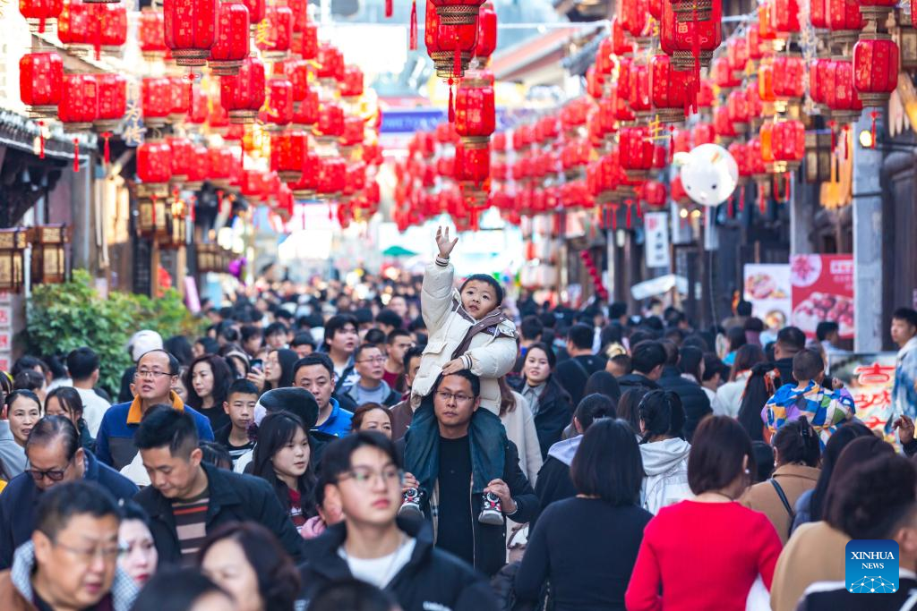 Imagen del 10 de febrero de 2024 de turistas divirtiéndose en una calle histórica y cultural en el marco del Festival de Primavera, en la ciudad de Anshun, en la provincia de Guizhou, en el suroeste de China. El Festival de Primavera y las prácticas sociales del pueblo chino en la celebración del año nuevo tradicional que lo integran fueron inscritos el miércoles por la Organización de las Naciones Unidas para la Educación, la Ciencia y la Cultura (UNESCO) en la Lista Representativa del Patrimonio Cultural Inmaterial de la Humanidad. (Xinhua/Chen Xi)
