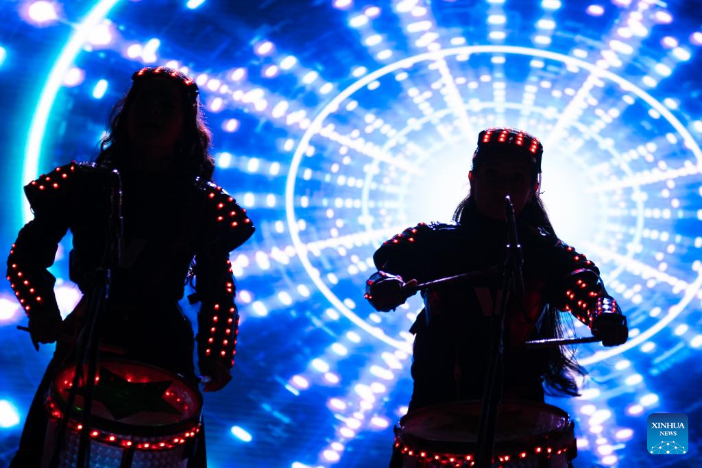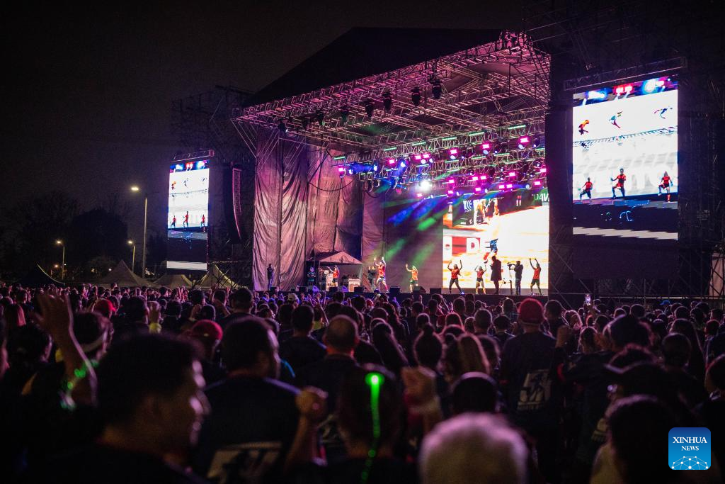 BOGOTA, 7 diciembre, 2024 (Xinhua) -- Imagen del 6 de diciembre de 2024 de artistas realizando una presentación musical durante la carrera recreativa "Bogotá Brilla 5K" en el Parque Metropolitano Simón Bolívar, en Bogotá, Colombia. (Xinhua/Andrés Moreno)