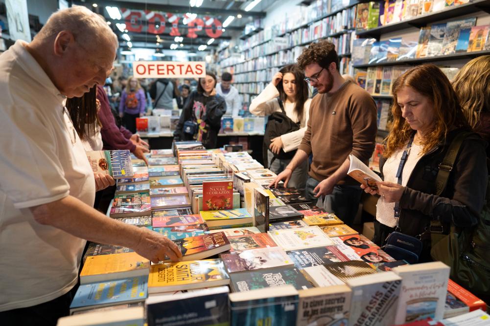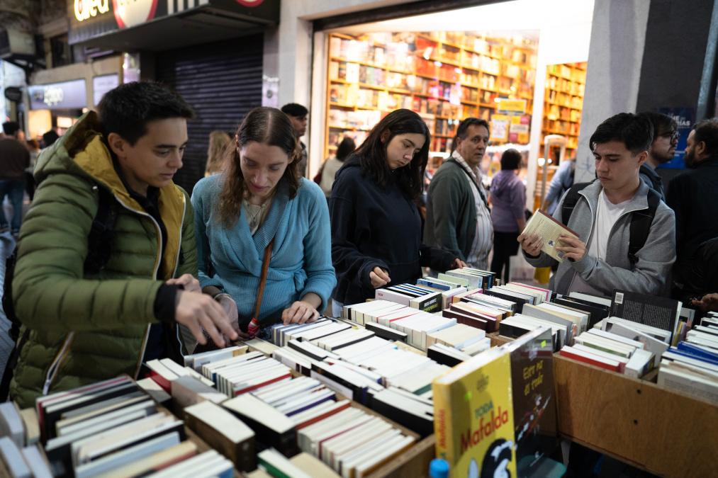 BUENOS AIRES, 8 diciembre, 2024 (Xinhua) -- Imagen del 7 de diciembre de 2024 de personas observando libros exhibidos sobre una mesa durante una nueva edición de la "Noche de las Librerías", en la ciudad de Buenos Aires, capital de Argentina. La ciudad de Buenos Aires celebró la cultura desde la puesta del sol el sábado hasta la madrugada del domingo, en el marco de una nueva edición de la "Noche de las Librerías", una actividad con epicentro en espacios de literatura ubicados en la emblemática avenida Corrientes de la capital argentina, los que permanecieron abiertos para deleite de los amantes de la lectura y los libros. (Xinhua/Martín Zabala)