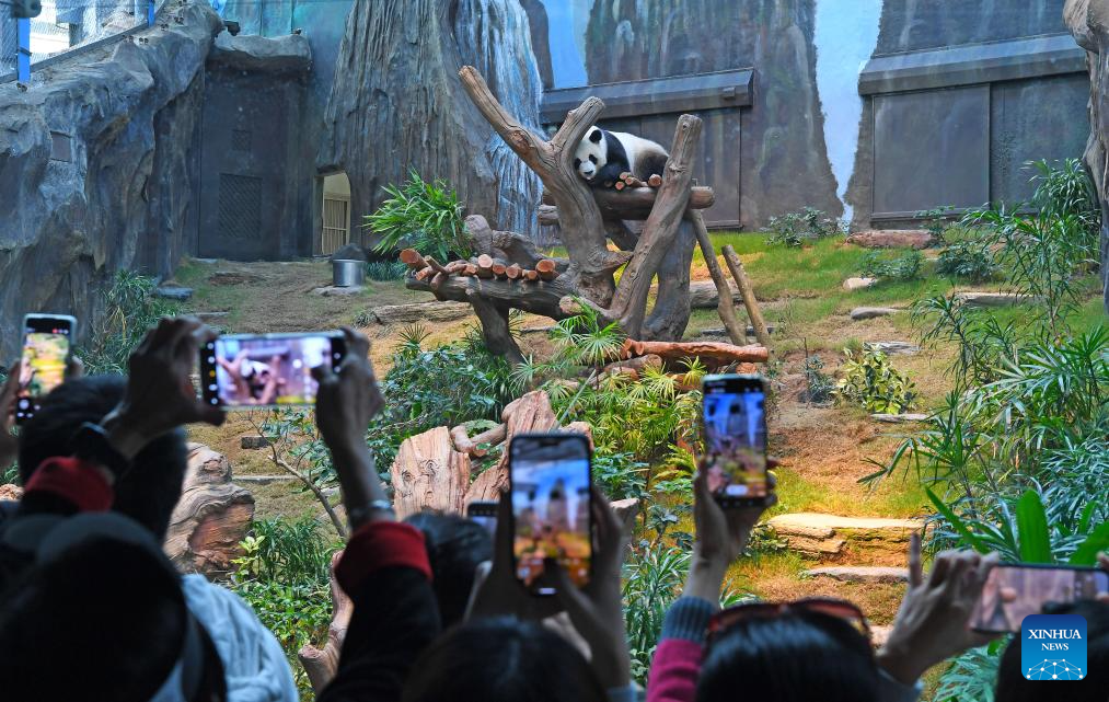 HONG KONG, 8 diciembre, 2024 (Xinhua) -- Visitantes toman fotografías de un panda gigante en el Ocean Park Hong Kong, en Hong Kong, en el sur de China, el 8 de diciembre de 2024. Los pandas gigantes "An An" y "Ke Ke" regalados por el gobierno central a la Región Administrativa Especial de Hong Kong (RAEHK) hicieron su debut público en el Ocean Park Hong Kong el domingo. (Xinhua/Chen Duo)