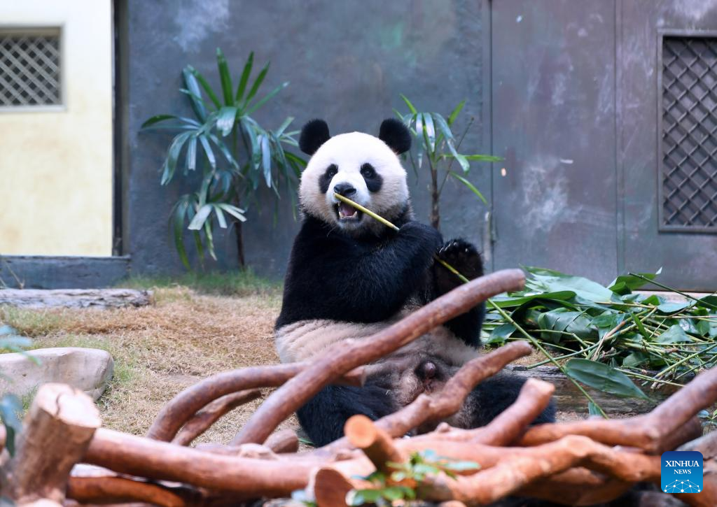 HONG KONG, 8 diciembre, 2024 (Xinhua) -- Un panda gigante come bambú en el Ocean Park Hong Kong, en Hong Kong, en el sur de China, el 8 de diciembre de 2024. Los pandas gigantes "An An" y "Ke Ke" regalados por el gobierno central a la Región Administrativa Especial de Hong Kong (RAEHK) hicieron su debut público en el Ocean Park Hong Kong el domingo. (Xinhua/Chen Duo)