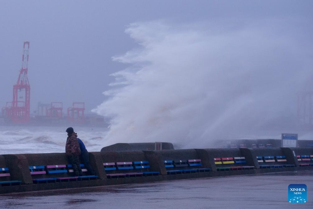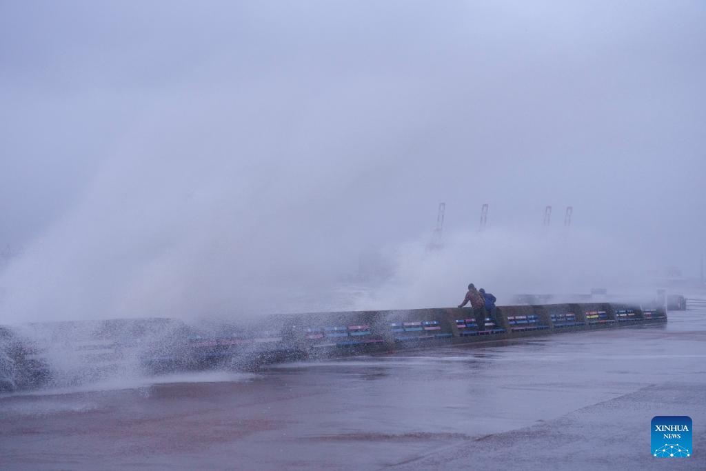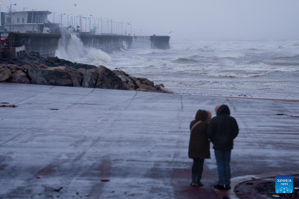 NEW BRIGHTON, 8 diciembre, 2024 (Xinhua) -- Imagen del 7 de diciembre de 2024 de personas observando como las olas se estrellan contra el paseo marítimo durante la tormenta Darragh, en New Brighton, cerca de Liverpool, Reino Unido. Decenas de miles de hogares se quedaron sin electricidad, el transporte ferroviario y aéreo sufrió interrupciones y se cancelaron eventos deportivos en todo Reino Unido el sábado debido a la tormenta Darragh. Una rara advertencia roja por viento, emitida por la Oficina Meteorológica, está vigente para el suroeste de Inglaterra y Gales hasta el mediodía del sábado, lo que indica un peligro potencial para la vida debido al mal tiempo. También se han emitido varias advertencias ámbar y amarillas por viento y lluvia en otras partes del país. Mientras tanto, hay más de 100 advertencias y alertas de inundaciones en vigor. (Xinhua/Jon Super)