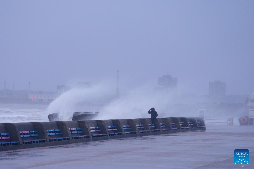 NEW BRIGHTON, 8 diciembre, 2024 (Xinhua) -- Imagen del 7 de diciembre de 2024 de un peatón visto mientras las olas chocan contra el paseo marítimo durante la tormenta Darragh, en New Brighton, cerca de Liverpool, Reino Unido. Decenas de miles de hogares se quedaron sin electricidad, el transporte ferroviario y aéreo sufrió interrupciones y se cancelaron eventos deportivos en todo Reino Unido el sábado debido a la tormenta Darragh. Una rara advertencia roja por viento, emitida por la Oficina Meteorológica, está vigente para el suroeste de Inglaterra y Gales hasta el mediodía del sábado, lo que indica un peligro potencial para la vida debido al mal tiempo. También se han emitido varias advertencias ámbar y amarillas por viento y lluvia en otras partes del país. Mientras tanto, hay más de 100 advertencias y alertas de inundaciones en vigor. (Xinhua/Jon Super)