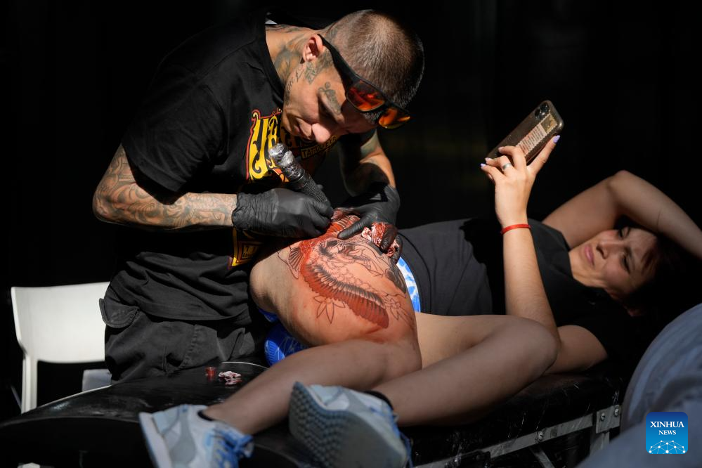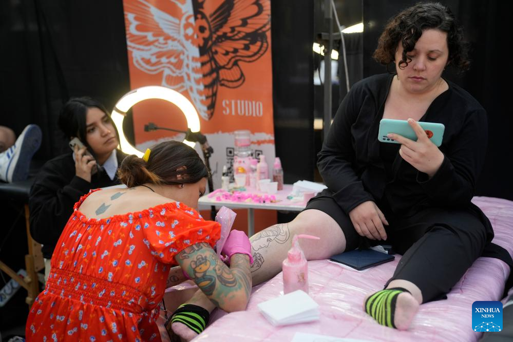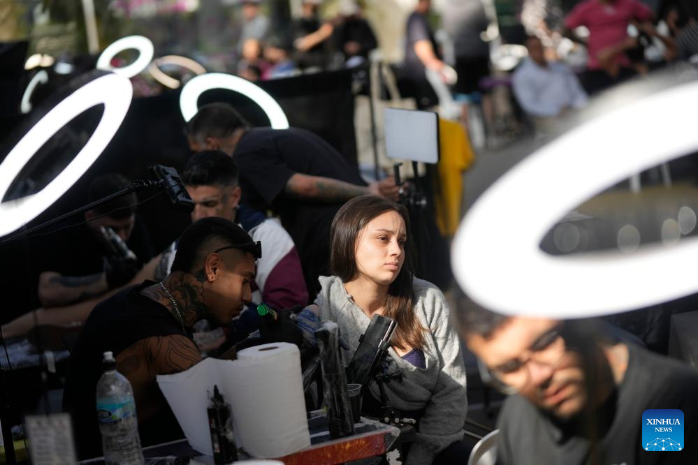 MONTEVIDEO, 8 diciembre, 2024 (Xinhua) -- Una artista realiza un tatuaje a una mujer durante la Expo Tattoo Uruguay 2024 en el Espacio Modelo, en Montevideo, capital de Uruguay, el 8 de diciembre de 2024. (Xinhua/Nicolás Celaya)