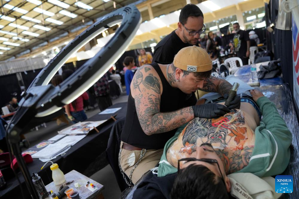 MONTEVIDEO, 8 diciembre, 2024 (Xinhua) -- Un artista realiza un tatuaje a un hombre durante la Expo Tattoo Uruguay 2024 en el Espacio Modelo, en Montevideo, capital de Uruguay, el 8 de diciembre de 2024. (Xinhua/Nicolás Celaya)