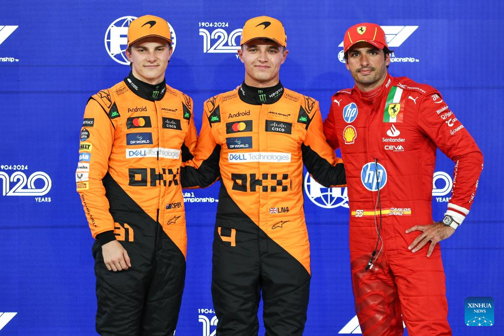 ABU DABI, 8 diciembre, 2024 (Xinhua) -- Imagen del 7 de diciembre de 2024 del ganador del primer lugar, el piloto británico de la escudería McLaren, Lando Norris (c), el ganador del segundo lugar, el piloto australiano de la escudería McLaren, Oscar Piastri (d), y el ganador del tercer lugar, el piloto español de la escudería Ferrari, Carlos Sainz, posando al término de la sesión de clasificación del Gran Premio de Abu Dabi de Fórmula 1 en el Circuito de Yas Marina, en Abu Dabi, Emiratos Arabes Unidos. (Xinhua/Qian Jun)