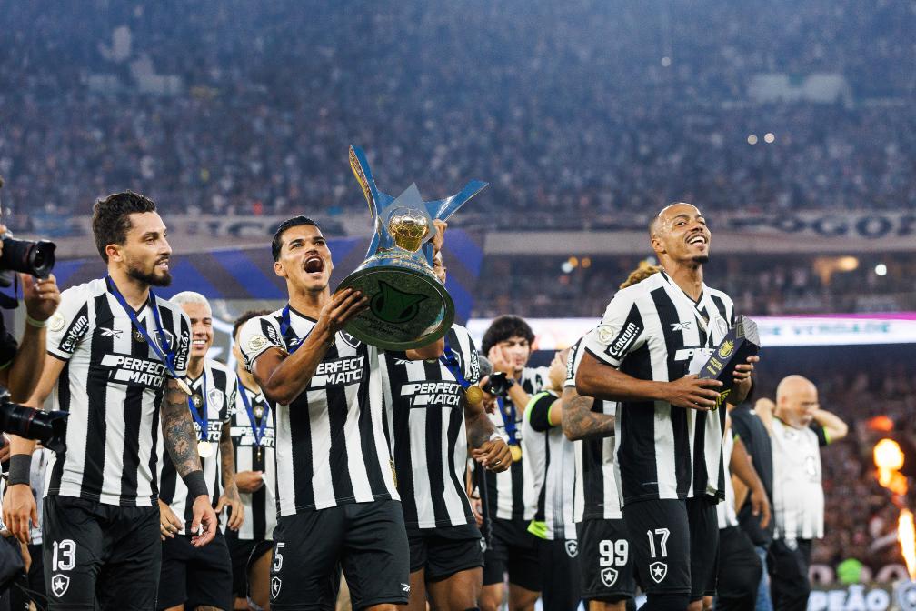 RIO DE JANEIRO, 9 diciembre, 2024 (Xinhua) -- Imagen del 8 de diciembre de 2024 del jugador Danilo Barbosa (c), de Botafogo, festejando con el trofeo durante la ceremonia de premiación al término del partido correspondiente a la jornada 38 del Campeonato Brasileño Serie A, ante Sao Paulo, celebrado en el Estadio Nilton Santos, en Río de Janeiro, Brasil. El Campeonato Brasileño de 2024, uno de los más emocionantes de la historia del torneo de fútbol brasileño, concluyó el domingo con el Botafogo proclamándose campeón tras un ayuno de 29 años, al ganar por 2-1 al Sao Paulo en la última jornada, ocho días después de conquistar su primera Copa Libertadores de América, al vencer el duelo brasileño ante el Atlético Mineiro en la final jugada en Argentina. (Xinhua/Claudia Martini)