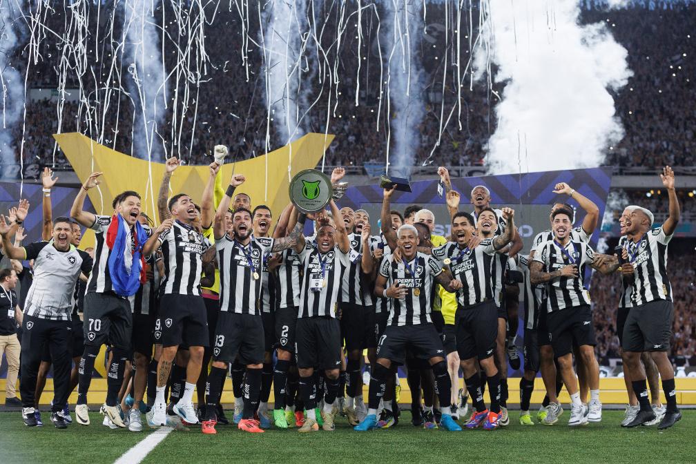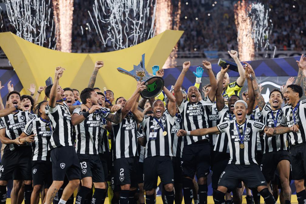 RIO DE JANEIRO, 9 diciembre, 2024 (Xinhua) -- Imagen del 8 de diciembre de 2024 de jugadores de Botafogo festejando con el trofeo durante la ceremonia de premiación al término del partido correspondiente a la jornada 38 del Campeonato Brasileño Serie A, ante Sao Paulo, celebrado en el Estadio Nilton Santos, en Río de Janeiro, Brasil. El Campeonato Brasileño de 2024, uno de los más emocionantes de la historia del torneo de fútbol brasileño, concluyó el domingo con el Botafogo proclamándose campeón tras un ayuno de 29 años, al ganar por 2-1 al Sao Paulo en la última jornada, ocho días después de conquistar su primera Copa Libertadores de América, al vencer el duelo brasileño ante el Atlético Mineiro en la final jugada en Argentina. (Xinhua/Claudia Martini)