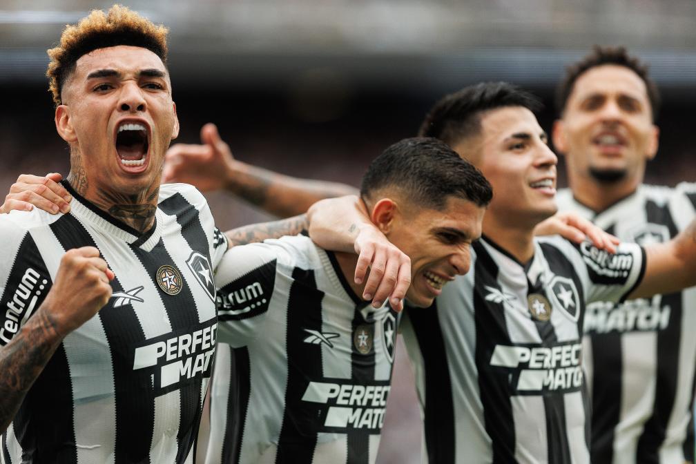 RIO DE JANEIRO, 9 diciembre, 2024 (Xinhua) -- Imagen del 8 de diciembre de 2024 del jugador Jefferson Savarino (2-i), de Botafogo, festejando su anotación junto a sus compañeros durante el partido correspondiente a la jornada 38 del Campeonato Brasileño Serie A, ante Sao Paulo, celebrado en el Estadio Nilton Santos, en Río de Janeiro, Brasil. El Campeonato Brasileño de 2024, uno de los más emocionantes de la historia del torneo de fútbol brasileño, concluyó el domingo con el Botafogo proclamándose campeón tras un ayuno de 29 años, al ganar por 2-1 al Sao Paulo en la última jornada, ocho días después de conquistar su primera Copa Libertadores de América, al vencer el duelo brasileño ante el Atlético Mineiro en la final jugada en Argentina. (Xinhua/Claudia Martini)