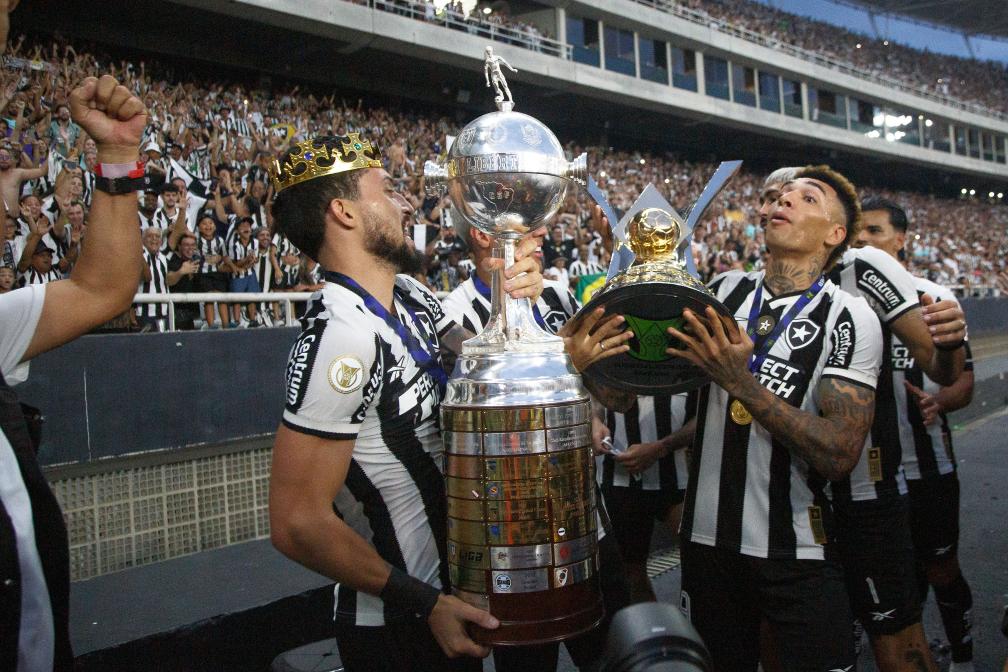 RIO DE JANEIRO, 9 diciembre, 2024 (Xinhua) -- Imagen del 8 de diciembre de 2024 de jugadores de Botafogo festejando con los trofeos del Campeonato Brasileño Serie A y de la Copa Conmebol Libertadores durante la ceremonia de premiación al término del partido correspondiente a la jornada 38 del Campeonato Brasileño Serie A, ante Sao Paulo, celebrado en el Estadio Nilton Santos, en Río de Janeiro, Brasil. El Campeonato Brasileño de 2024, uno de los más emocionantes de la historia del torneo de fútbol brasileño, concluyó el domingo con el Botafogo proclamándose campeón tras un ayuno de 29 años, al ganar por 2-1 al Sao Paulo en la última jornada, ocho días después de conquistar su primera Copa Libertadores de América, al vencer el duelo brasileño ante el Atlético Mineiro en la final jugada en Argentina. (Xinhua/Claudia Martini)
