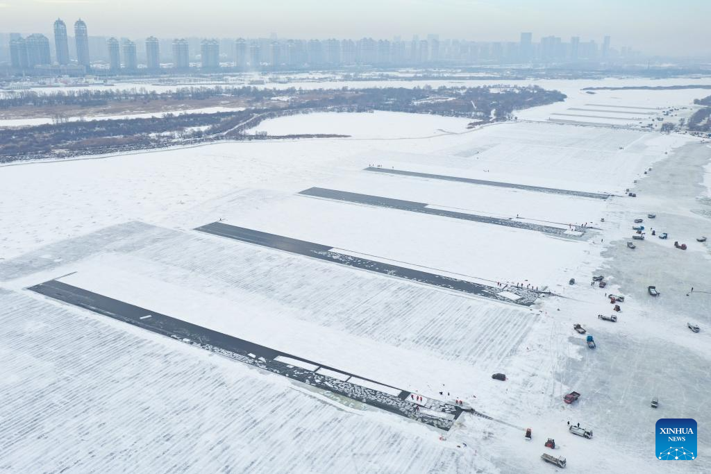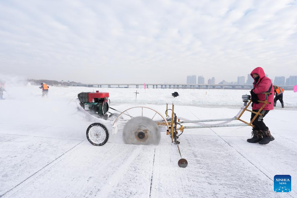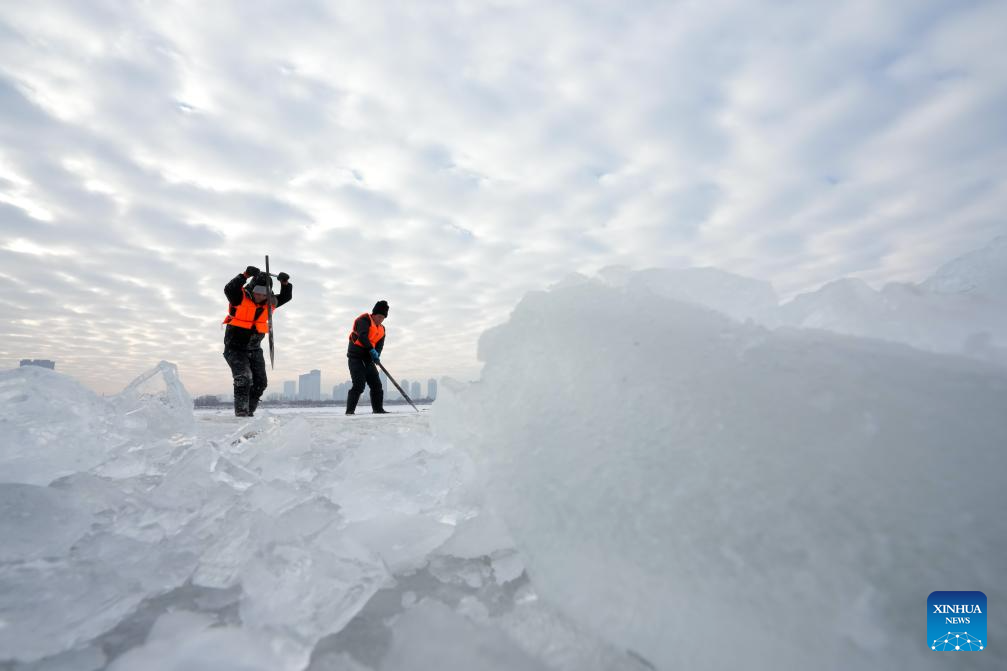 Recolectan hielo del río Songhu para construir paisajes en las atracciones turísticas
