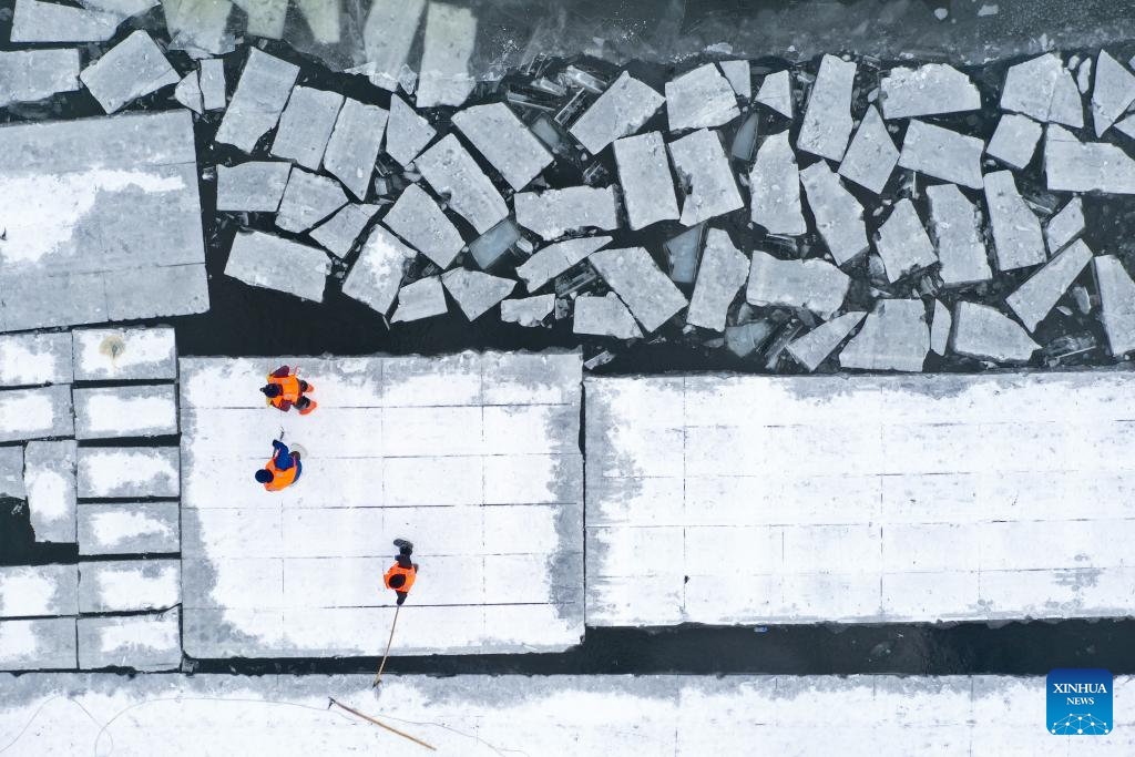 HARBIN, 9 diciembre, 2024 (Xinhua) -- Vista aérea tomada con un dron el 9 de diciembre de 2024 de trabajadores recolectando hielo del río Songhua, en Harbin, capital de la provincia de Heilongjiang, en el noreste de China. A medida que comienza la temporada de recolección de hielo, se cortan y elevan cubos de hielo del congelado río Songhua para construir paisajes en las atracciones turísticas que atraviesan la ciudad. La más destacada de ellas es el Mundo de Hielo y Nieve de Harbin, un conocido parque temático estacional de la ciudad que goza de gran popularidad cada invierno. (Xinhua/Xie Jianfei)