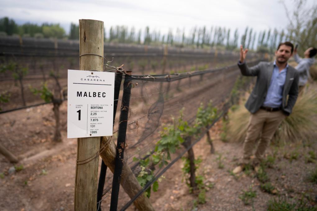 LUJAN DE CUYO, 10 diciembre, 2024 (Xinhua) -- Imagen del 7 de octubre de 2024 del empresario vitivinícola argentino, Nicolás Perinetti, gerente de exportaciones para Asia de Casarena Bodegas y Viñedos, recorriendo los viñedos de la variedad malbec, en la ciudad de Luján de Cuyo, en la provincia de Mendoza, Argentina. Las Pequeñas y Medianas Empresas de Argentina ven posibilidades para aumentar los despachos de productos manufacturados de mayor valor agregado, como los vinos de alta calidad, al mercado chino, gracias a la apertura de alto nivel que se está llevando a cabo en el país asiático, indicó el empresario vitivinícola argentino, Nicolás Perinetti, gerente de exportaciones para Asia de Casarena Bodegas y Viñedos. (Xinhua/Martín Zabala)
