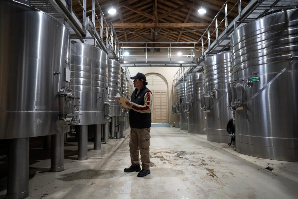 LUJAN DE CUYO, 10 diciembre, 2024 (Xinhua) -- Imagen del 7 de octubre de 2024 de un trabajador de la bodega argentina Casarena Bodegas y Viñedos controlando los tanques en la sala de tanques de la bodega, en la ciudad de Luján de Cuyo, en la provincia de Mendoza, Argentina. Las Pequeñas y Medianas Empresas de Argentina ven posibilidades para aumentar los despachos de productos manufacturados de mayor valor agregado, como los vinos de alta calidad, al mercado chino, gracias a la apertura de alto nivel que se está llevando a cabo en el país asiático, indicó el empresario vitivinícola argentino, Nicolás Perinetti, gerente de exportaciones para Asia de Casarena Bodegas y Viñedos. (Xinhua/Martín Zabala)
