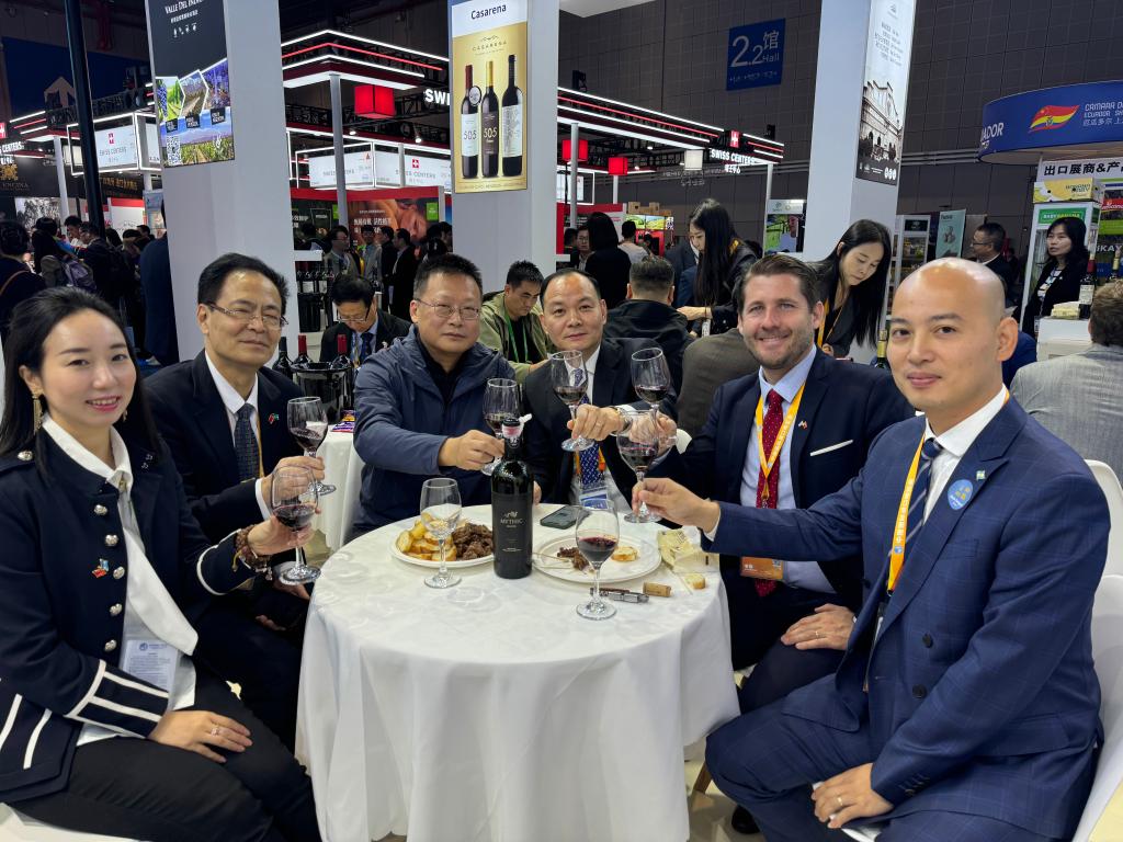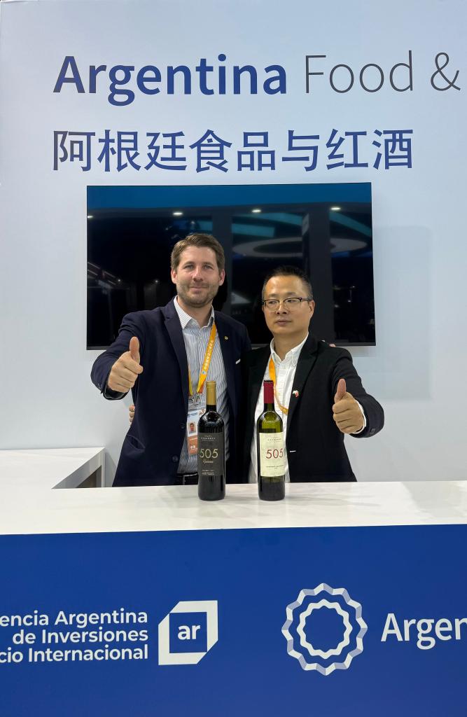 SHANGHAI, 10 diciembre, 2024 (Xinhua) -- Imagen cedida por la bodega argentina Casarena Bodegas y Viñedos del 10 de noviembre de 2024 del empresario vitivinícola argentino, Nicolás Perinetti (i), gerente de exportaciones para Asia de Casarena Bodegas y Viñedos, posando junto a uno de sus distribuidores de la ciudad de Shanghai, en el estand de la Agencia Argentina de Inversiones y Comercio Internacional durante la VII Exposición Internacional de Importaciones de China, en Shanghai, en el este de China. Las Pequeñas y Medianas Empresas de Argentina ven posibilidades para aumentar los despachos de productos manufacturados de mayor valor agregado, como los vinos de alta calidad, al mercado chino, gracias a la apertura de alto nivel que se está llevando a cabo en el país asiático, indicó Perinetti. (Xinhua/Casarena Bodegas y Viñedos)