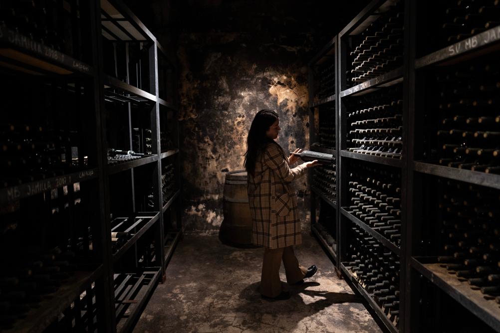 LUJAN DE CUYO, 10 diciembre, 2024 (Xinhua) -- Imagen del 7 de octubre de 2024 de Ivy Reynoso, gerente de hospitalidad de la bodega argentina Casarena Bodegas y Viñedos, observando una botella de vino malbec del año 2008 en la cava de la bodega, en la ciudad de Luján de Cuyo, en la provincia de Mendoza, Argentina. Las Pequeñas y Medianas Empresas de Argentina ven posibilidades para aumentar los despachos de productos manufacturados de mayor valor agregado, como los vinos de alta calidad, al mercado chino, gracias a la apertura de alto nivel que se está llevando a cabo en el país asiático, indicó el empresario vitivinícola argentino, Nicolás Perinetti, gerente de exportaciones para Asia de Casarena Bodegas y Viñedos. (Xinhua/Martín Zabala)