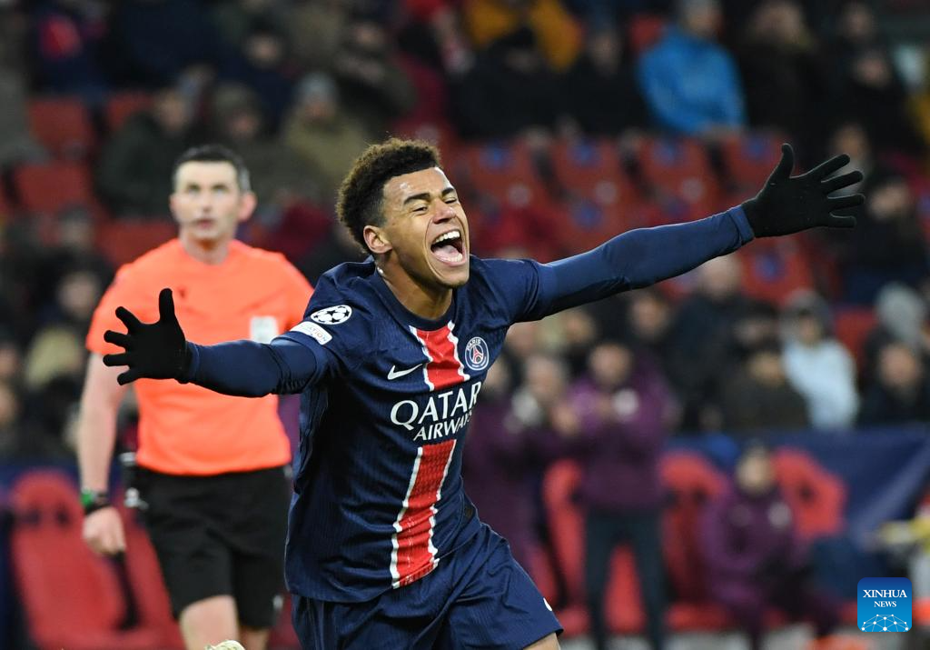 SALZBURGO, 11 diciembre, 2024 (Xinhua) -- Imagen del 10 de diciembre de 2024 de Desire Doue, de Paris Saint-Germain, festejando su anotación durante el partido de la Liga de Campeones de la UEFA entre FC Salzburg y Paris Saint-Germain, en Salzburgo, Austria. (Xinhua/He Canling)