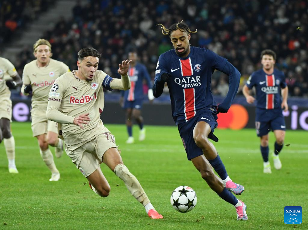 SALZBURGO, 11 diciembre, 2024 (Xinhua) -- Imagen del 10 de diciembre de 2024 de Bradley Barcola (d), de Paris Saint-Germain, disputando el balón con Amar Dedic, de FC Salzburg, durante el partido de la Liga de Campeones de la UEFA entre FC Salzburg y Paris Saint-Germain, en Salzburgo, Austria. (Xinhua/He Canling)