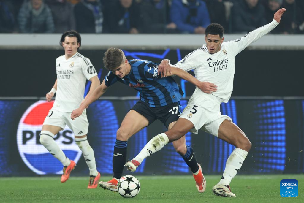 BERGAMO, 11 diciembre, 2024 (Xinhua) -- Imagen del 10 de diciembre de 2024 de Jude Bellingham (d), de Real Madrid, disputando el balón con Charles De Ketelaere (c), de Atalanta, durante el partido de la Liga de Campeones de la UEFA entre Atalanta y Real Madrid, en Bérgamo, Italia. (Xinhua/Li Jing)