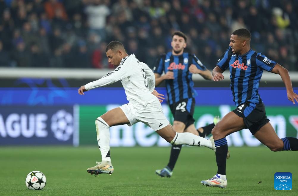 BERGAMO, 11 diciembre, 2024 (Xinhua) -- Imagen del 10 de diciembre de 2024 de Kylian Mbappé (i), de Real Madrid, abriéndose paso durante el partido de la Liga de Campeones de la UEFA entre Atalanta y Real Madrid, en Bérgamo, Italia. (Xinhua/Li Jing)