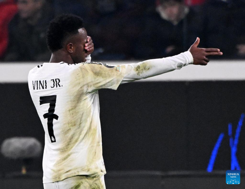 BERGAMO, 11 diciembre, 2024 (Xinhua) -- Imagen del 10 de diciembre de 2024 de Vinicius Junior, de Real Madrid, festejando su anotación durante el partido de la Liga de Campeones de la UEFA entre Atalanta y Real Madrid, en Bérgamo, Italia. (Xinhua/Alberto Lingria)