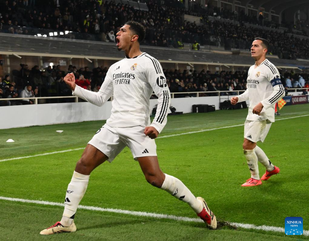 BERGAMO, 11 diciembre, 2024 (Xinhua) -- Imagen del 10 de diciembre de 2024 de Jude Bellingham (i), de Real Madrid, festejando su anotación durante el partido de la Liga de Campeones de la UEFA entre Atalanta y Real Madrid, en Bérgamo, Italia. (Xinhua/Alberto Lingria)