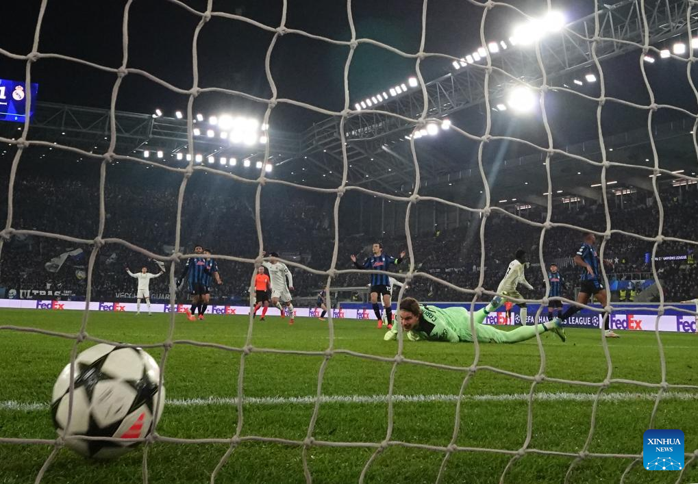 BERGAMO, 11 diciembre, 2024 (Xinhua) -- Imagen del 10 de diciembre de 2024 de Vinicius Junior (3-d), de Real Madrid, realizando una anotación durante el partido de la Liga de Campeones de la UEFA entre Atalanta y Real Madrid, en Bérgamo, Italia. (Xinhua/Alberto Lingria)