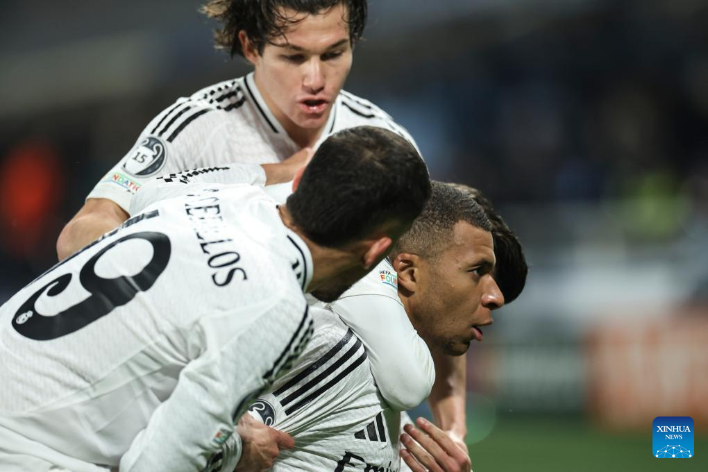 BERGAMO, 11 diciembre, 2024 (Xinhua) -- Imagen del 10 de diciembre de 2024 de Kylian Mbappé (d), de Real Madrid, festejando su anotación con sus compañeros durante el partido de la Liga de Campeones de la UEFA entre Atalanta y Real Madrid, en Bérgamo, Italia. (Xinhua/Li Jing)