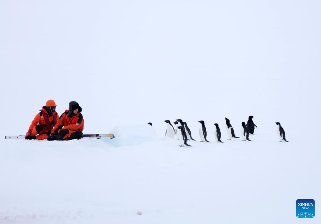 A BORDO DEL XUELONG 2, 11 diciembre, 2024 (Xinhua) -- Imagen del 8 de diciembre de 2024 de miembros del equipo de la 41ª expedición antártica de China y pingüinos vistos en la Antártida. Actualmente en la 41ª expedición antártica de China, los rompehielos de investigación Xuelong y Xuelong 2 de China o Dragón de Nieve y Dragón de Nieve 2, llevan a cabo operaciones de descarga alrededor de la Estación Zhongshan, una base de investigación china en la Antártida. (Xinhua/Huang Taoming)