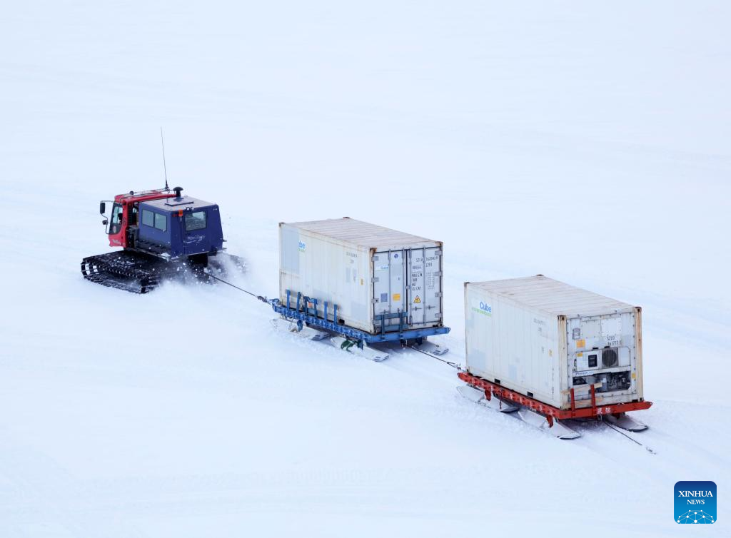 A BORDO DEL XUELONG 2, 11 diciembre, 2024 (Xinhua) -- Imagen del 9 de diciembre de 2024 de una moto de nieve transportando suministros a la Estación Zhongshan de China, en la Antártida. Actualmente en la 41ª expedición antártica de China, los rompehielos de investigación Xuelong y Xuelong 2 de China o Dragón de Nieve y Dragón de Nieve 2, llevan a cabo operaciones de descarga alrededor de la Estación Zhongshan, una base de investigación china en la Antártida. (Xinhua/Huang Taoming)