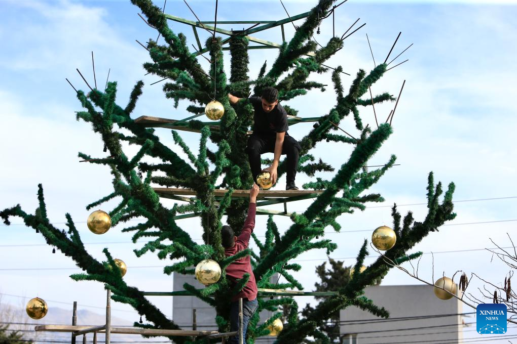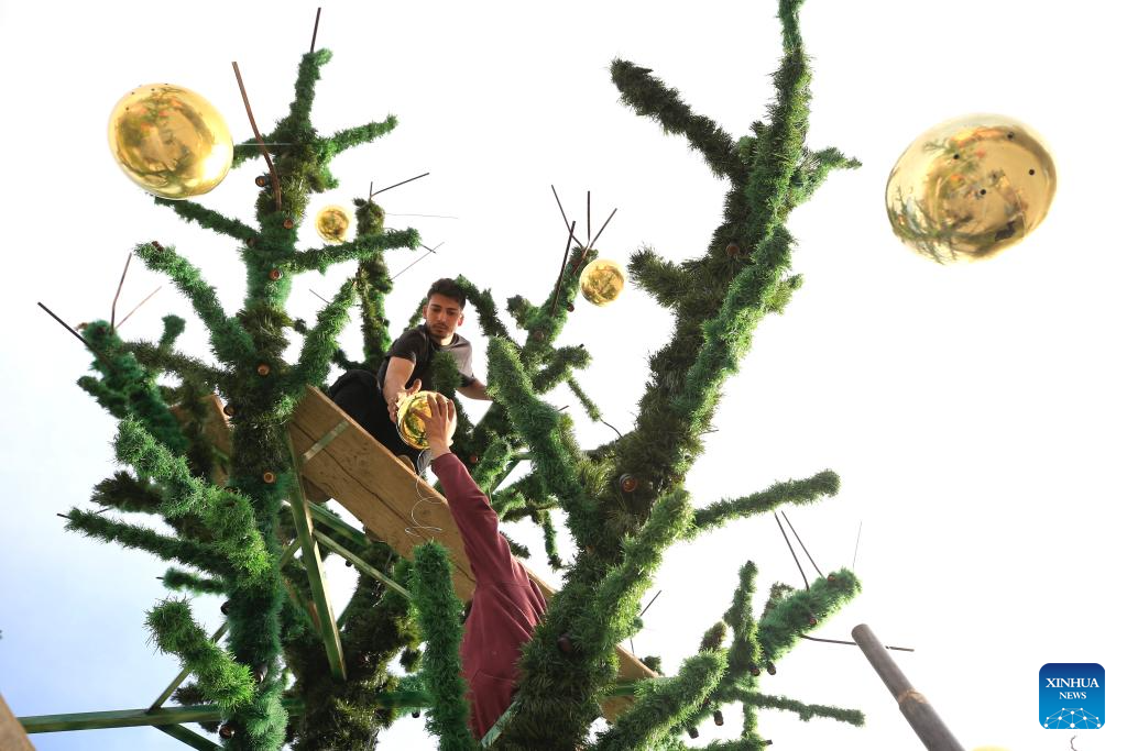 MARJEYOUN, 12 diciembre, 2024 (Xinhua) -- Imagen del 11 de diciembre de 2024 de personas adornando un enorme árbol de Navidad, en Marjeyoun, Líbano. (Xinhua/Ali Hashisho)