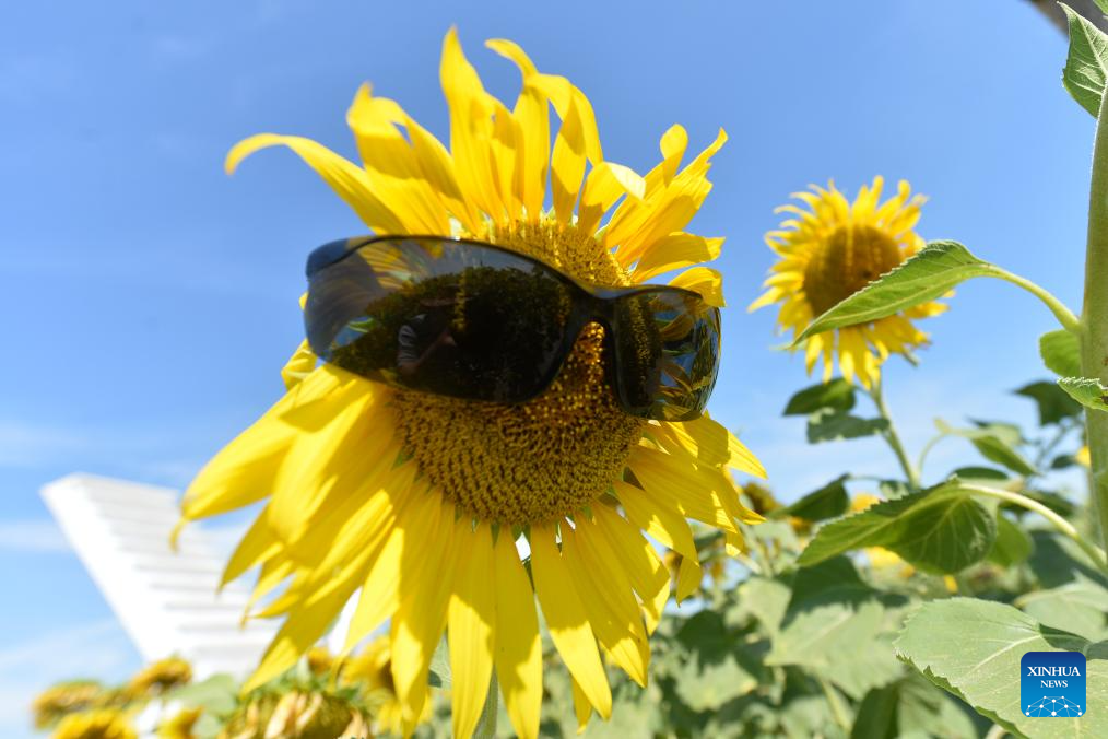 LOPBURI, 12 diciembre, 2024 (Xinhua) -- Imagen del 11 de diciembre de 2024 de un girasol con gafas de sol visto en un campo de girasoles, en la provincia de Lopburi, Tailandia. La provincia de Lopburi tiene uno de los campos de girasoles más grandes de Tailandia, lo que la convierte en un destino popular para los viajeros. (Xinhua/Rachen Sageamsak)