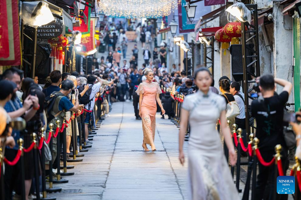MACAO, 12 diciembre, 2024 (Xinhua) -- Imagen del 3 de mayo de 2024 de modelos presentando creaciones en un evento en el área peatonal de la revitalizada Nueva Calle de Fulong, en la Región Administrativa Especial (RAE) de Macao, en el sur de China. El gobierno de la RAE de Macao se ha comprometido a revitalizar y utilizar las áreas históricas en la región. Un creciente número de habitantes y turistas visitan estas áreas hoy en día para sentir el encanto de la integración entre las culturas tradicionales y modernas. (Xinhua/Cheong Kam Ka)
