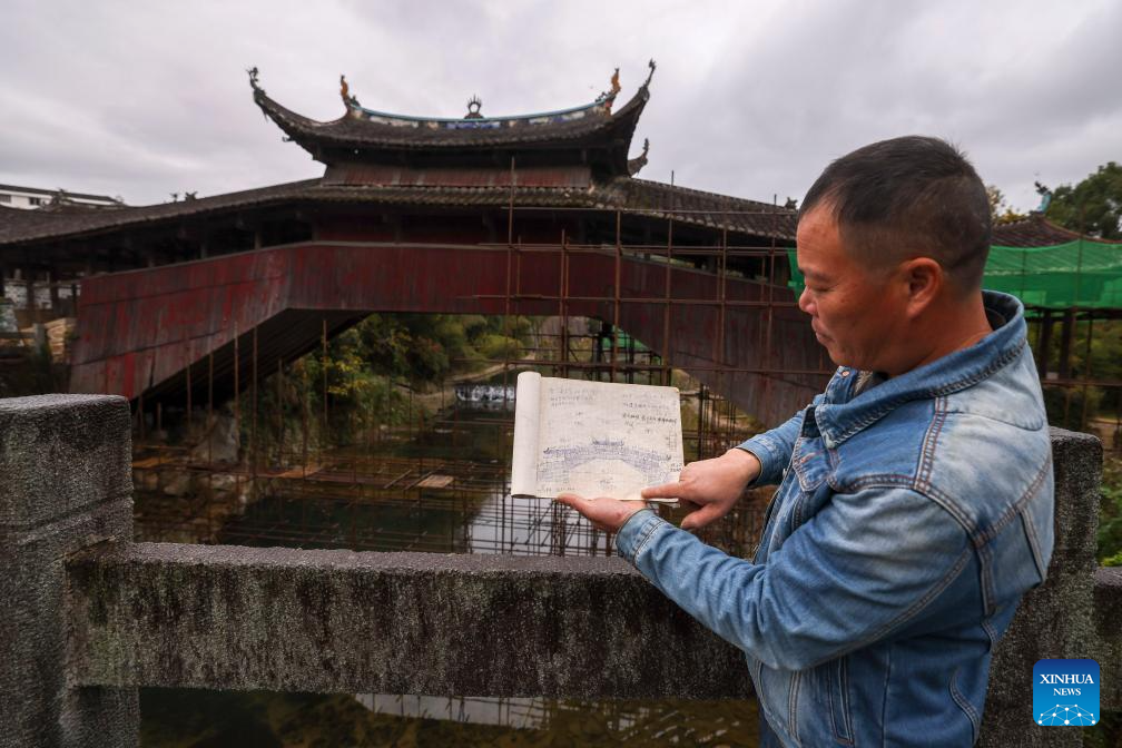 TAISHUN, 13 diciembre, 2024 (Xinhua) -- Imagen del 11 de diciembre de 2024 de Zeng Jiakuai, heredero a nivel provincial del diseño y las técnicas tradicionales chinas de construcción de puentes con arcadas de madera, mostrando su dibujo a mano de la estructura del puente Xidong frente al puente, en el distrito de Taishun de la ciudad de Wenzhou, en la provincia de Zhejiang, en el este de China. En el distrito de Taishun, los puentes con arcadas techados han servido durante mucho tiempo como importantes vías facilitando el transporte y beneficiando a los habitantes en zonas en las que abundan ríos y montañas. En la actualidad, Taishun alberga más de 30 antiguos puentes con arcadas techados incluidos los tradicionales puentes con arcadas de madera. El 5 de diciembre, la UNESCO incluyó al diseño y las técnicas tradicionales chinas de construcción de puentes con arcadas de madera en su Lista Representativa del Patrimonio Cultural Inmaterial de la Humanidad. (Xinhua/Jiang Han)