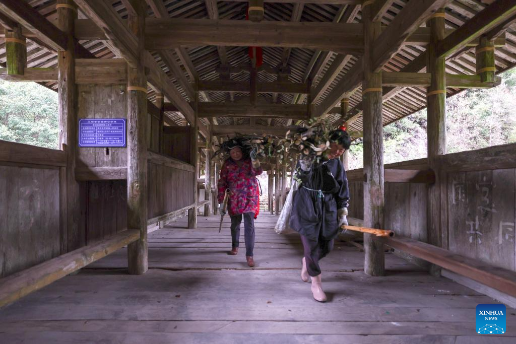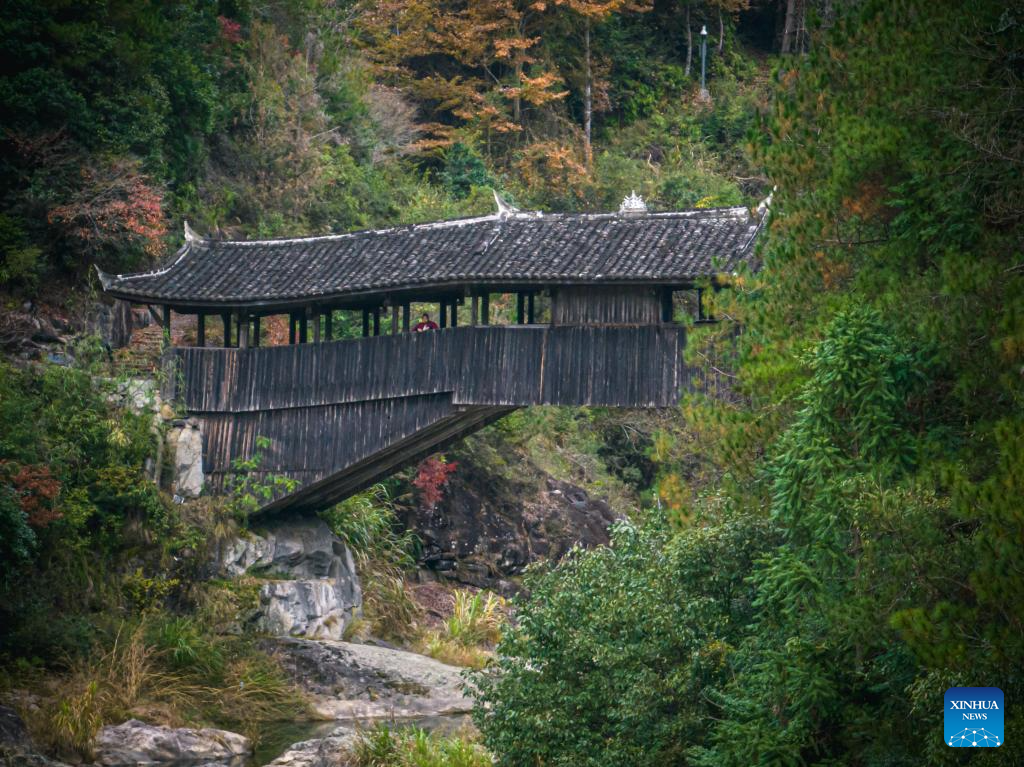 TAISHUN, 13 diciembre, 2024 (Xinhua) -- Imagen del 12 de diciembre de 2024 de aldeanos locales caminando sobre el puente Santiao, en el distrito de Taishun de la ciudad de Wenzhou, en la provincia de Zhejiang, en el este de China. En el distrito de Taishun, los puentes con arcadas techados han servido durante mucho tiempo como importantes vías facilitando el transporte y beneficiando a los habitantes en zonas en las que abundan ríos y montañas. En la actualidad, Taishun alberga más de 30 antiguos puentes con arcadas techados incluidos los tradicionales puentes con arcadas de madera. El 5 de diciembre, la UNESCO incluyó al diseño y las técnicas tradicionales chinas de construcción de puentes con arcadas de madera en su Lista Representativa del Patrimonio Cultural Inmaterial de la Humanidad. (Xinhua/Jiang Han)