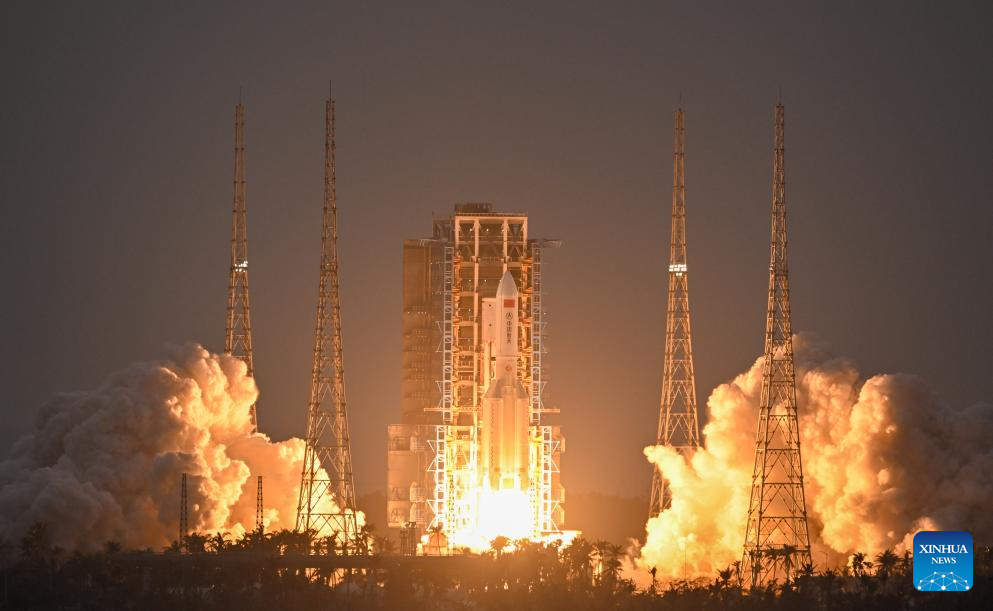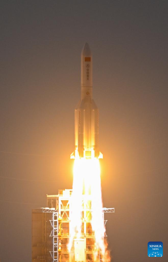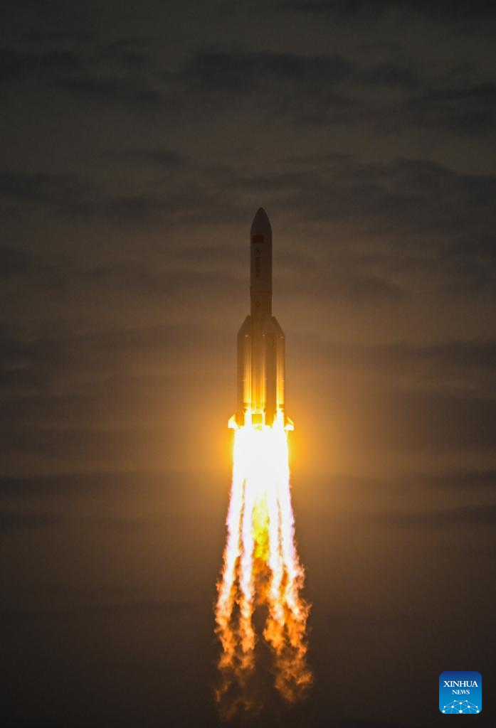 WENCHANG, 16 diciembre, 2024 (Xinhua) -- Un grupo de satélites de órbita terrestre baja es lanzado por un cohete portador Gran Marcha-5B, con una etapa superior Yuanzheng-2 (Expedición-2) en la punta del cohete, desde el sitio de lanzamiento espacial de Wenchang, en la provincia de Hainan, en el sur de China, el 16 de diciembre de 2024. China envió exitosamente el lunes al espacio el primer grupo de satélites de órbita terrestre baja para una constelación de internet satelital. A las 18:00 (hora de Beijing), este grupo de satélites fue lanzado y los satélites entraron en sus órbitas preestablecidas. (Xinhua/Yang Guanyu)