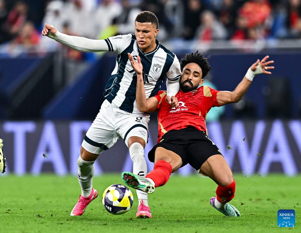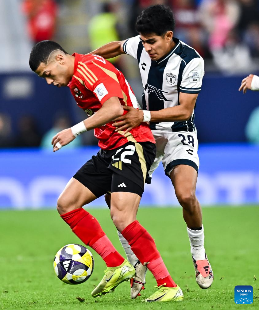 DOHA, 15 diciembre, 2024 (Xinhua) -- Imagen del 14 de diciembre de 2024 de Elías Montiel (d), de CF Pachuca, disputando el balón con Emam Ashour, de Al Ahly SC, durante el partido de la Copa Challenger de la FIFA entre Al Ahly SC de Egipto y CF Pachuca de México, parte de la Copa Intercontinental de la FIFA 2024, en Doha, Qatar. (Xinhua/Nikku)